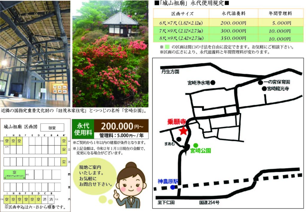 区画毎の永代使用料などは、住職までお尋ね下さい。(0274-67-4329)
